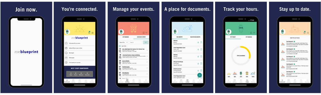 That means when you’re on-the-go, volunteering at a Zoe Blueprint Event, we’ll digitally track your hours so you don’t have to. Pretty handy, right? Right.